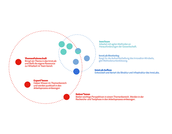 Um diese Perspektiven an den wichtigen Punkten im Innovationsprozess einzubeziehen, braucht es ein Rollensystem, das die Verantwortlichkeiten im InnoLab und in der Organisation festlegt.