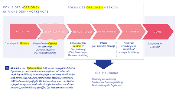 Optionen sind potenzielle Wege, die eine Organisation in Zukunft gehen könnte. Sie eröffnen Spielräume und erlauben es, flexibel auf neue Chancen zu reagieren, ohne sich sofort festzulegen. Mithilfe eines Optionen-Boards strukturieren, priorisieren, delegieren und verarbeiten wir Optionen.
